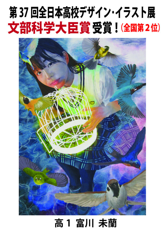 このほど、NPO法人全国美術デザイン教育振興会(ADEC)主催(文部科学省・経済産業省後援)「第37回全日本高校デザイン・イラスト展」において、全国774点の応募の中から、本校高校1年の富川未蘭さんの作品「Open My Heart」が、見事、文部科学大臣賞(全国第2位)を受賞しました。