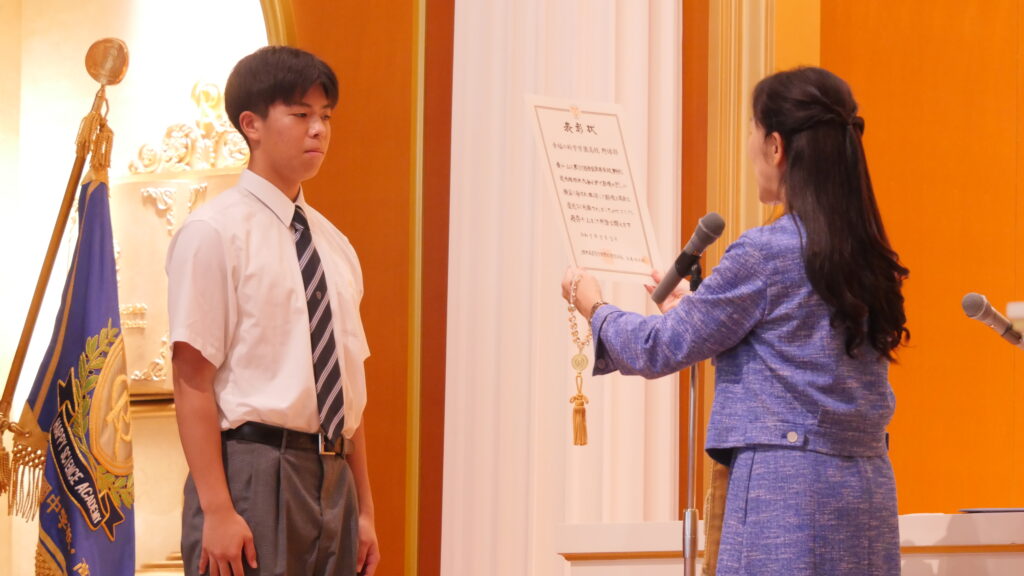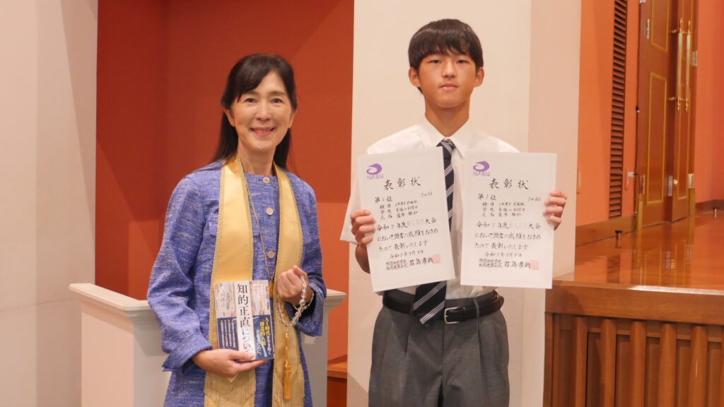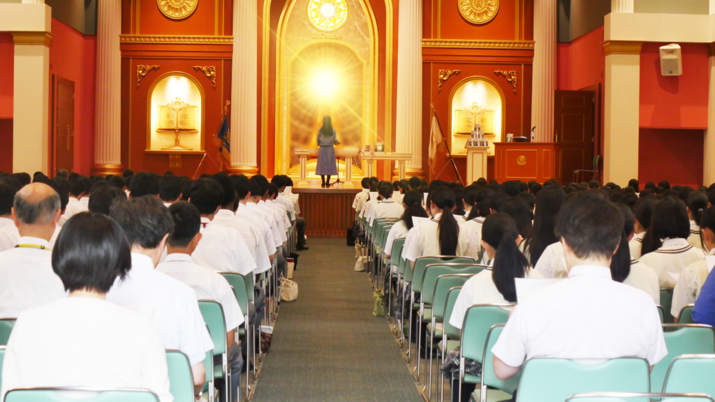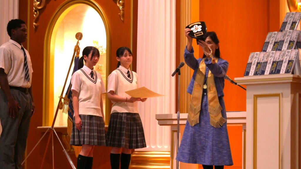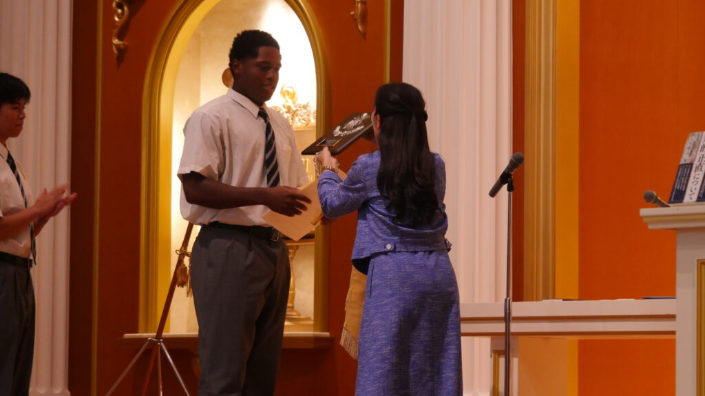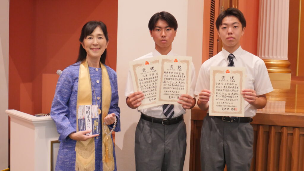 七の日式典の中では、生徒を代表し、生徒会長が経典を拝受しました。