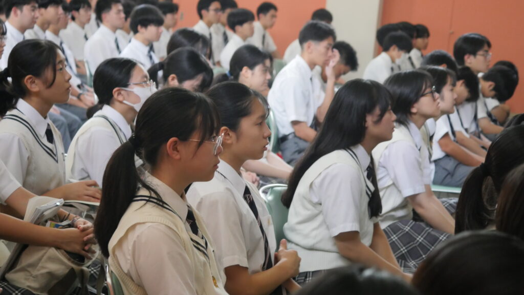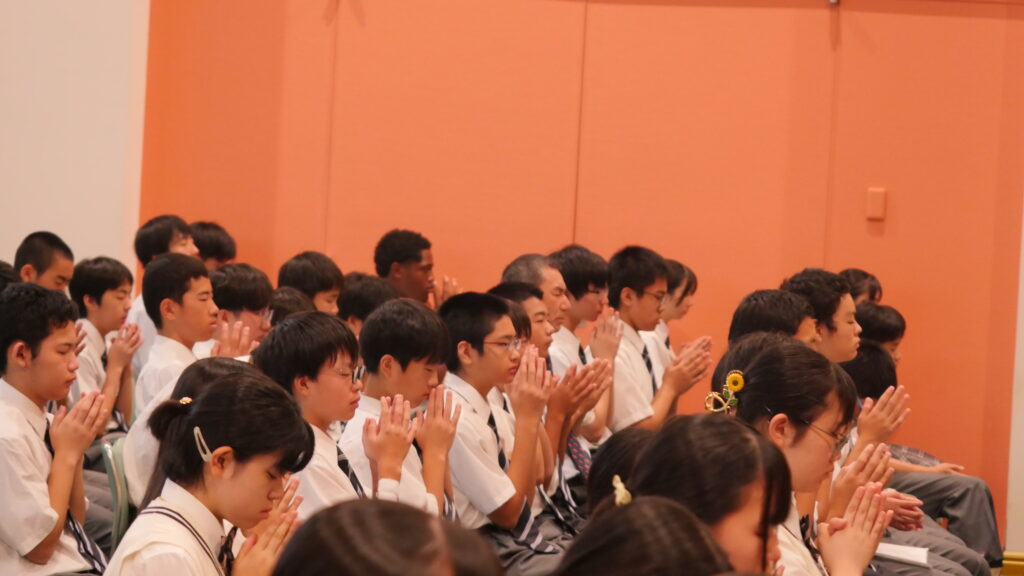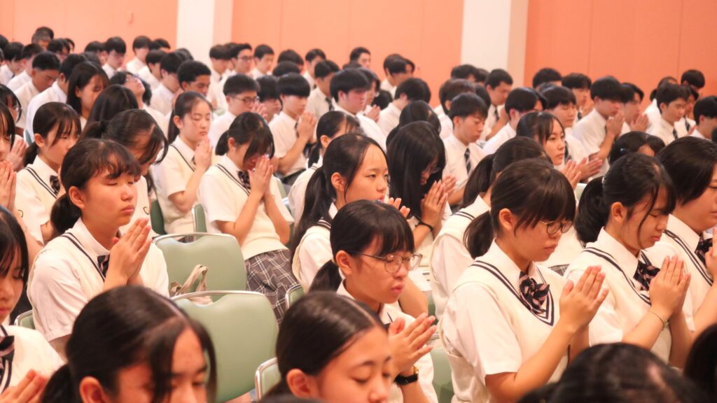 朝8時より、全校生徒・全職員が記念講堂に集まりました。
