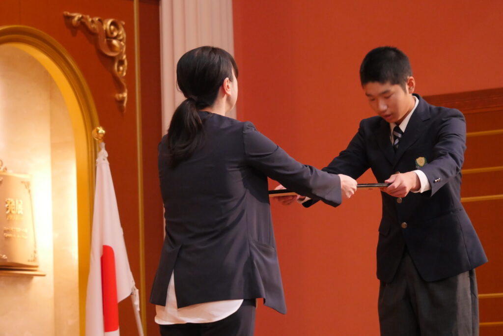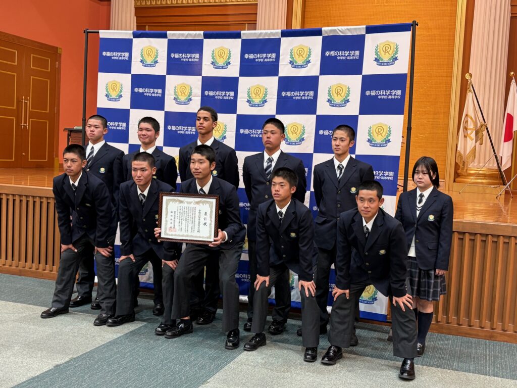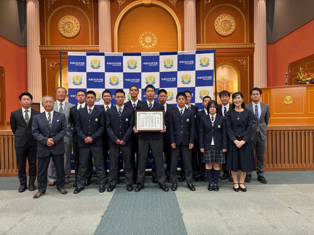 毎日新聞宇都宮支局長から、賞状を授与される幸福の科学学園高校野球部の主将。