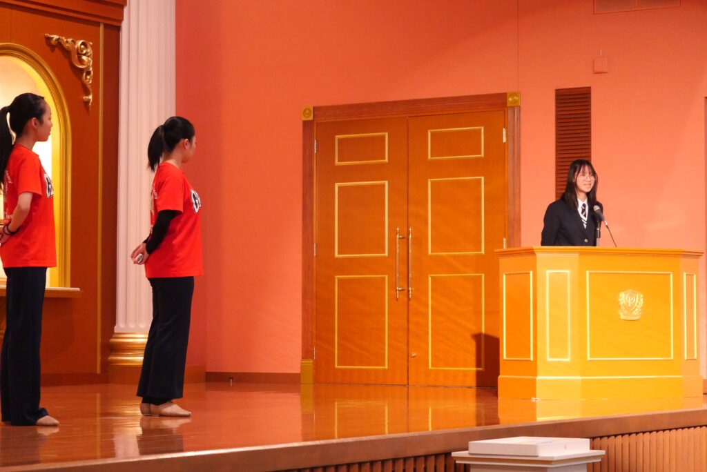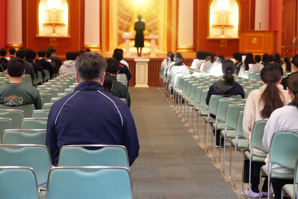 朝の祈りは、感染症予防のため、席をあけて座るため、本日は高校3年生と中学3年生が記念講堂に入室しています。その他の学年は教室で配信され、各教室にて壮行会に参加しました。