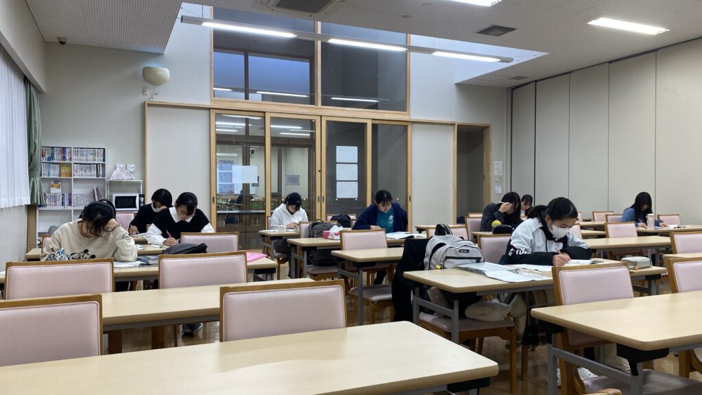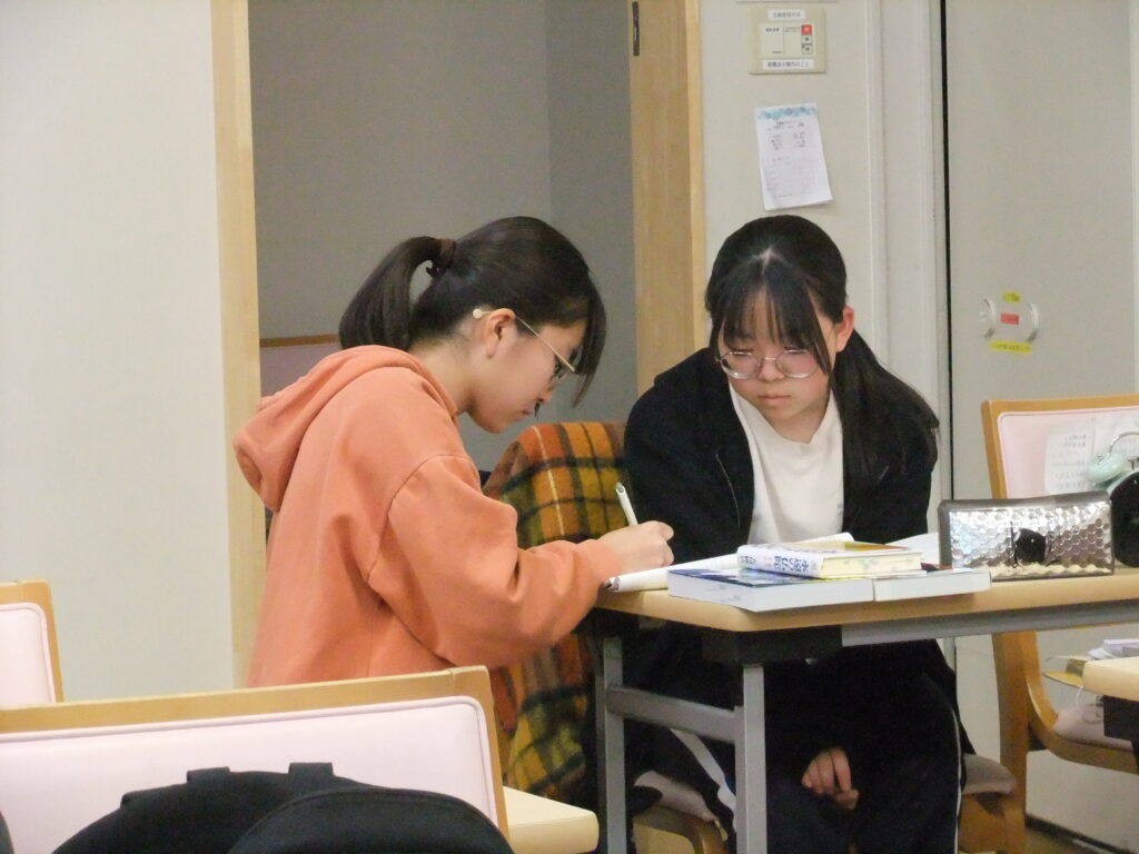 ガチ勉企画 2025.12.01 考査前の休日。 女子寮では、ガチ勉が行われました。 朝の6時30分~始まり、終了したのは、21時40分。ラウンジや学習室で行われました。 生徒が先生役となって、質問対応も行います。 考査直前となり、真剣に勉強していました。