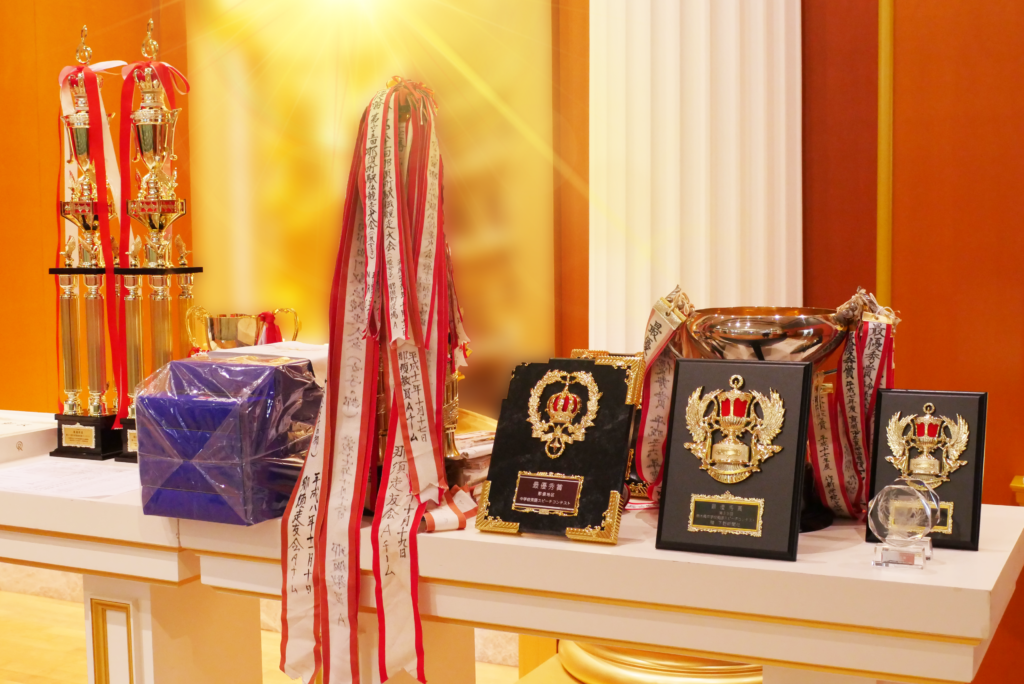 11月は表彰がたくさんありました。祭壇前には、トロフィーや盾が並びました。