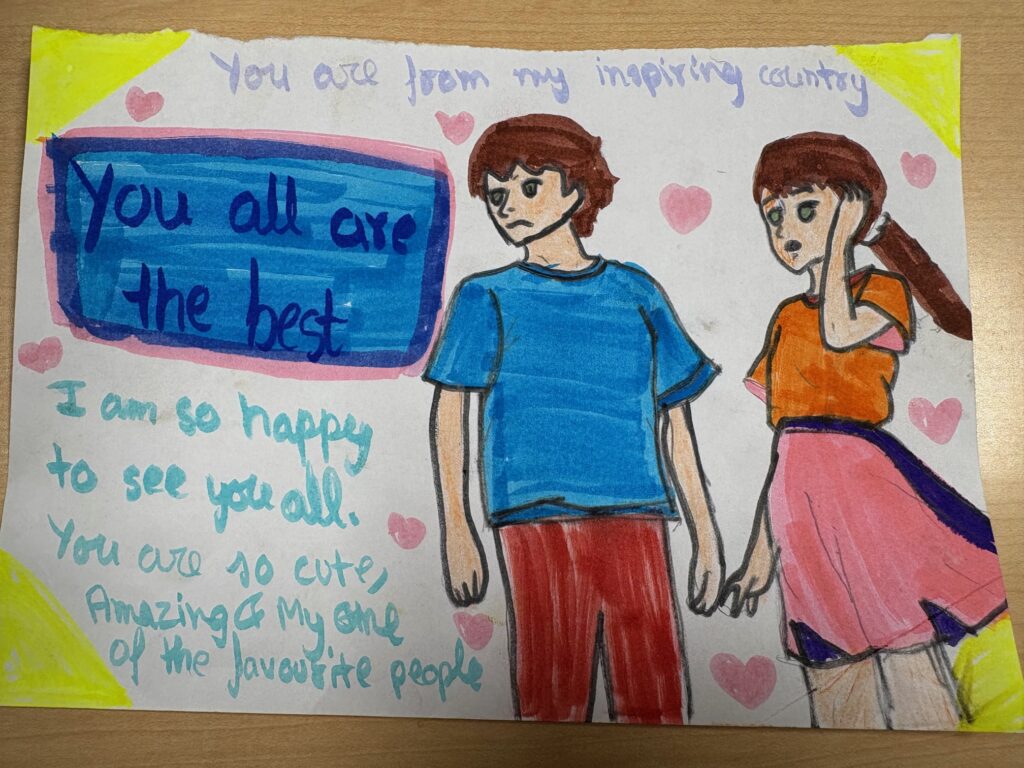 そして、すでに映画「ドラゴン・ハート」を鑑賞した生徒が、ステージにいた私に、主人公の「竜介と知美」を描いた絵をプレゼントしてくれました!