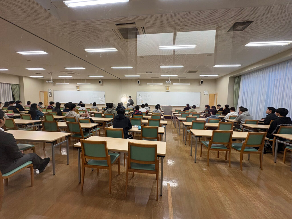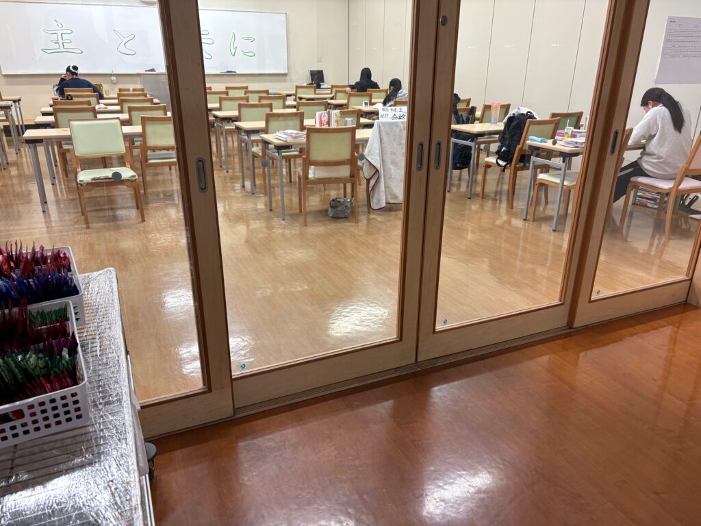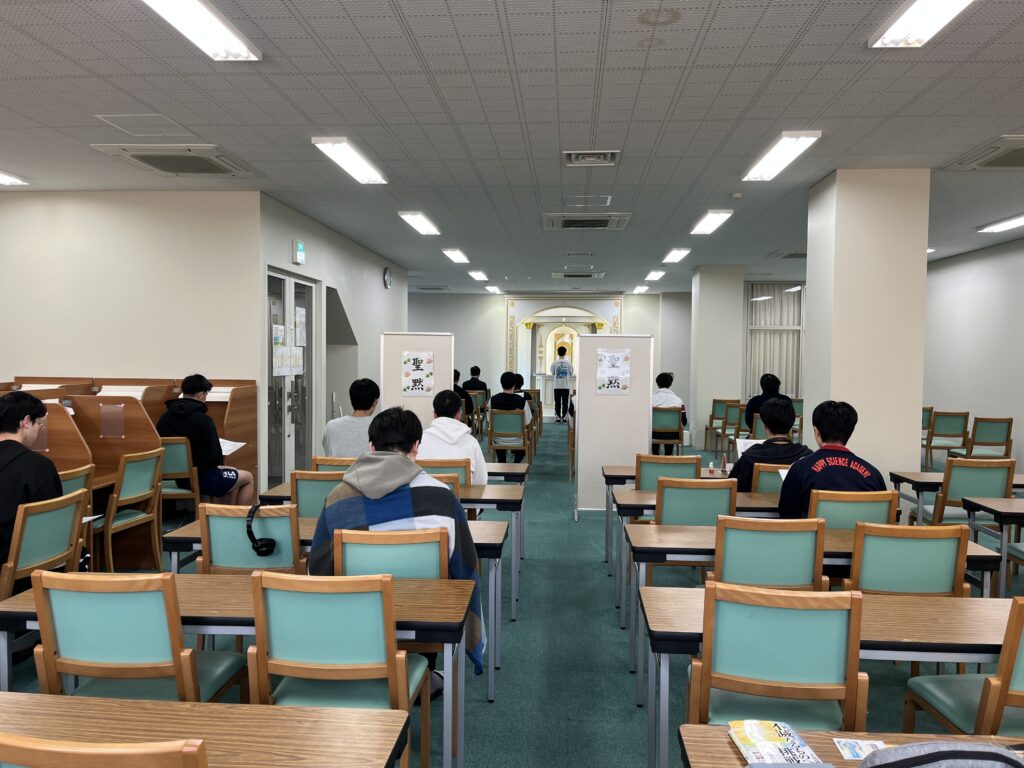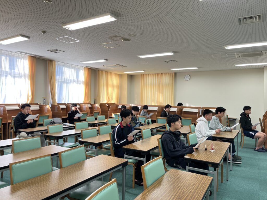 学習室には、毎日、高校3年生が全員集まります。先生から連絡や確認事項があります。お祈りも毎日欠かさず行います。