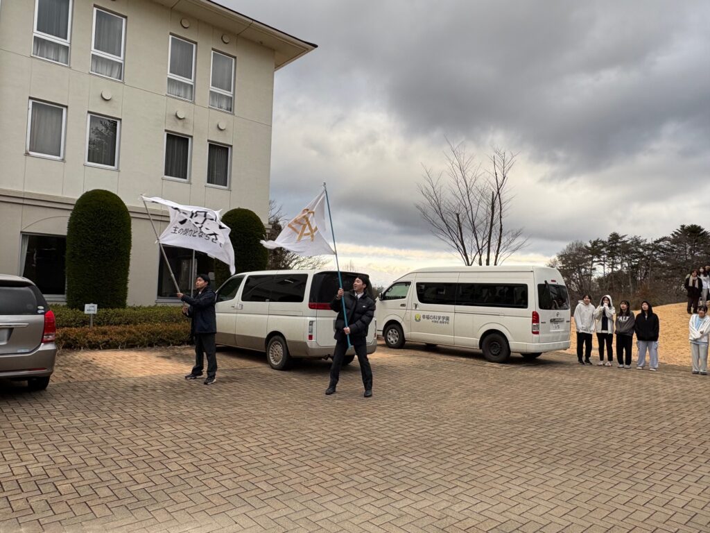 高2生以下で書いた「寄せ書き」を持って、生徒会メンバーが丘の上から、お見送り。