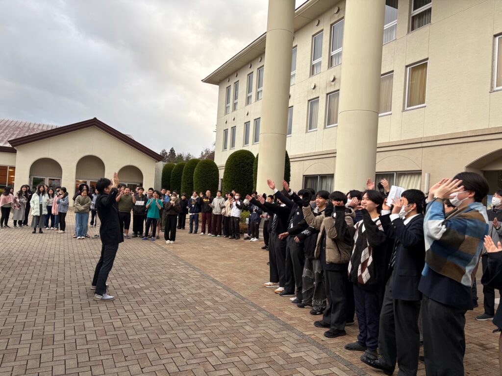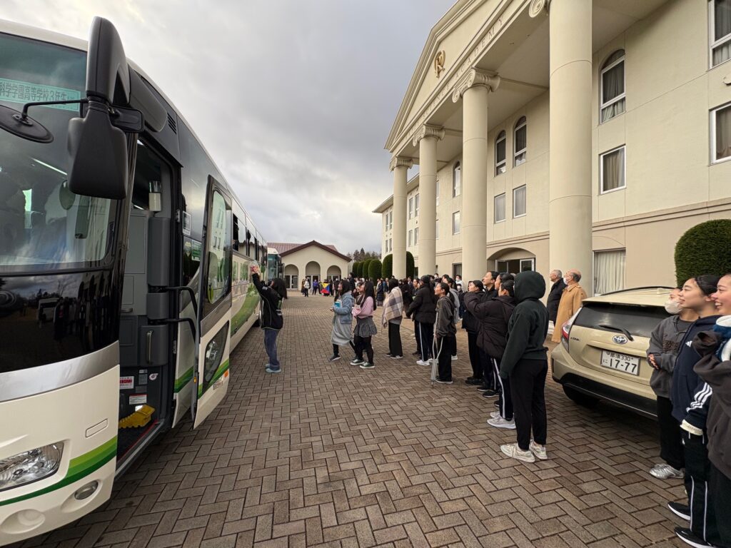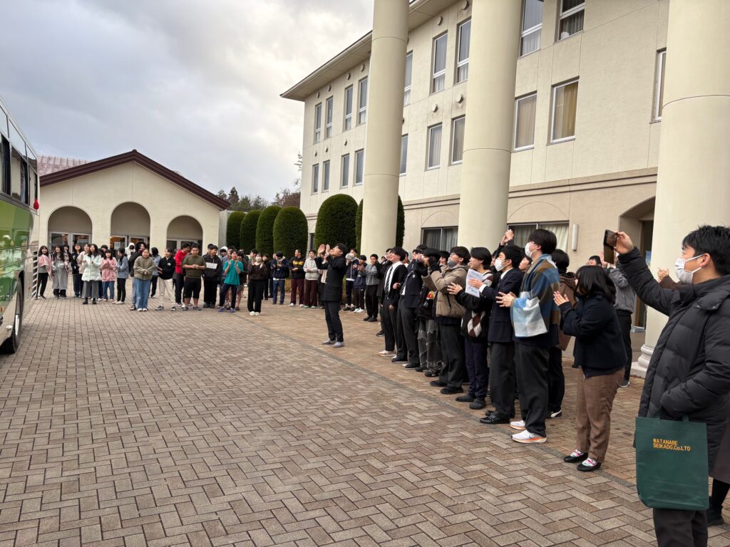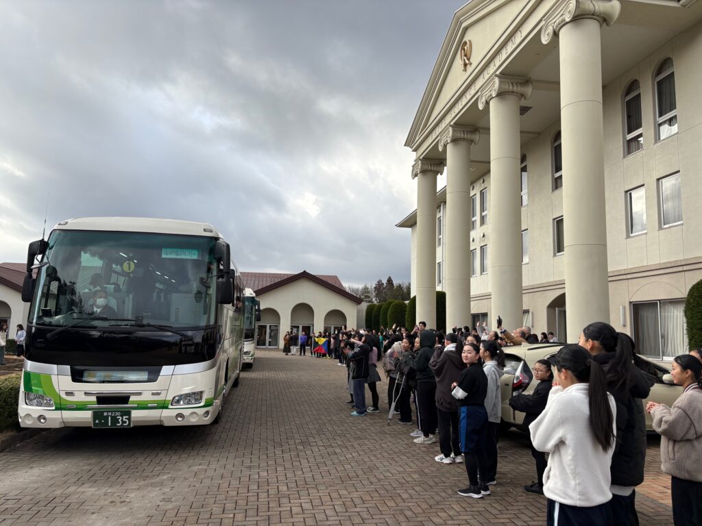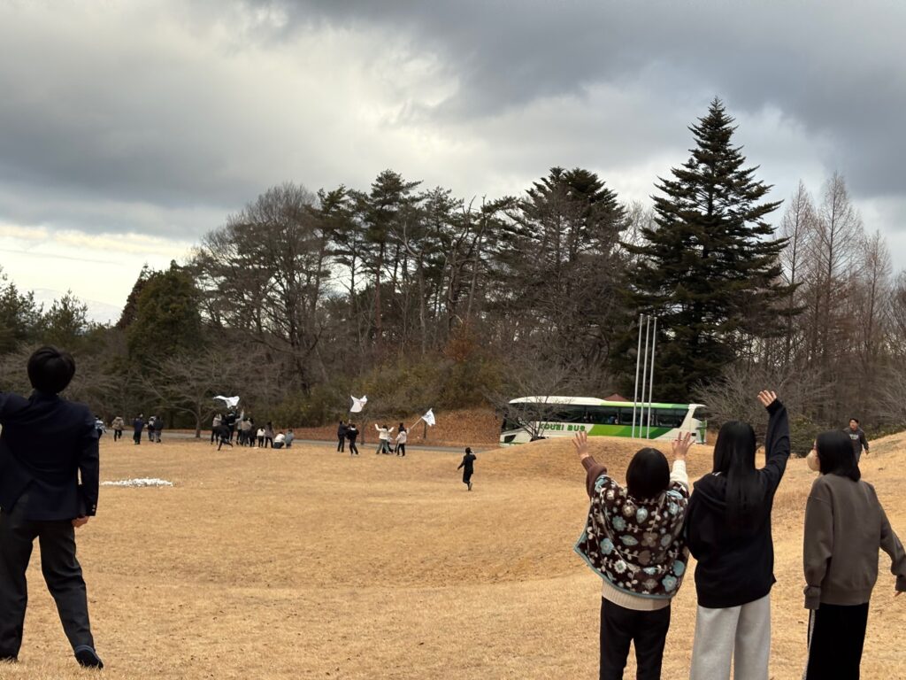 大勢の後輩たちが、先輩たちのバス出発にあわせ、見送りに来ました。