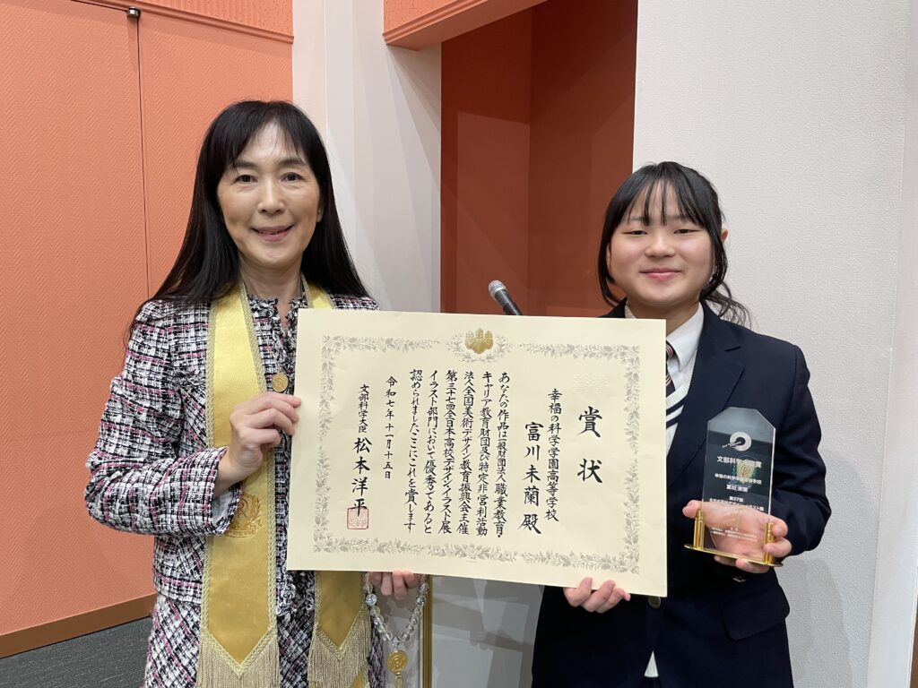 高校1年生の美術部の生徒が、「全日本高校デザイン・イラスト展」にて、「文部科学大臣賞」を受賞しました!全国で第二位の快挙です。