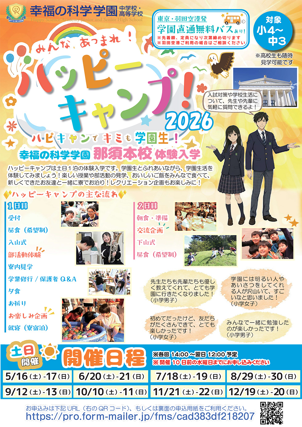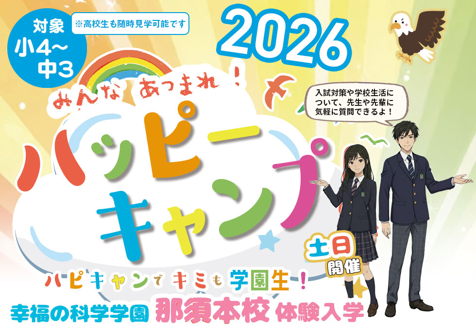 2026年度も、本校に進学をお考えのお子様や保護者の皆様、そして教育にご関心のある皆様を対象に、大好評の体験入学「ハッピー・キャンプ」(ハピキャン)を開催致します。